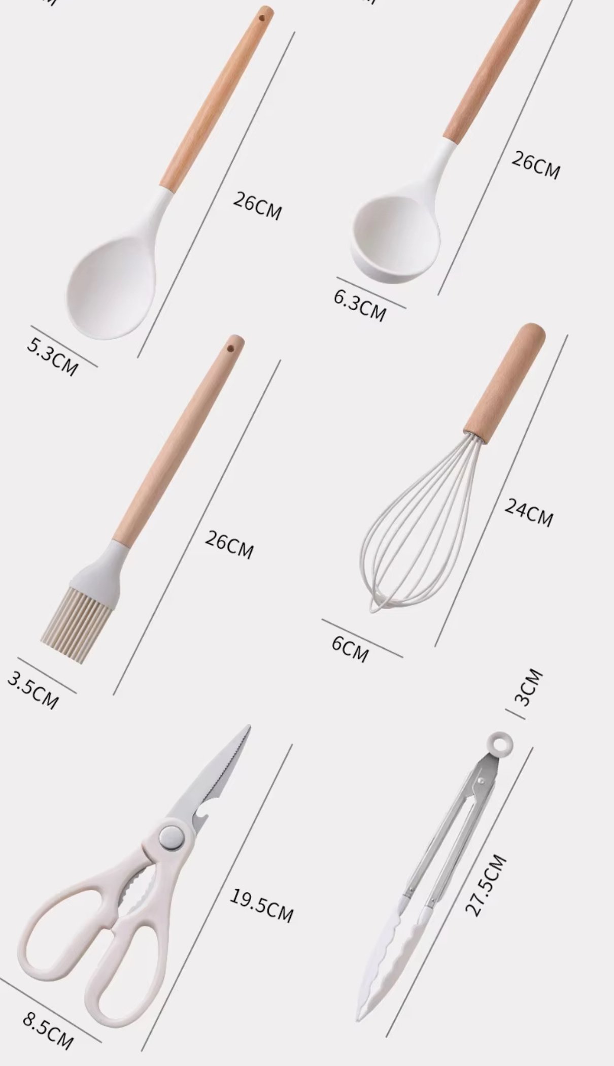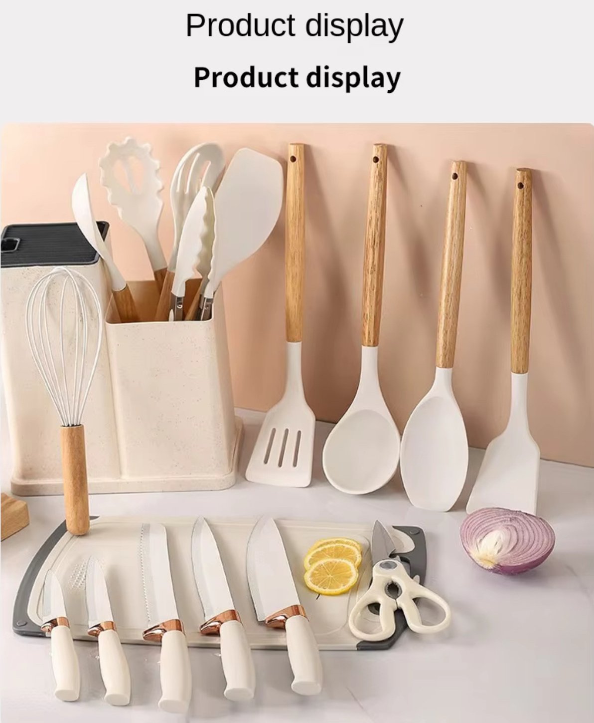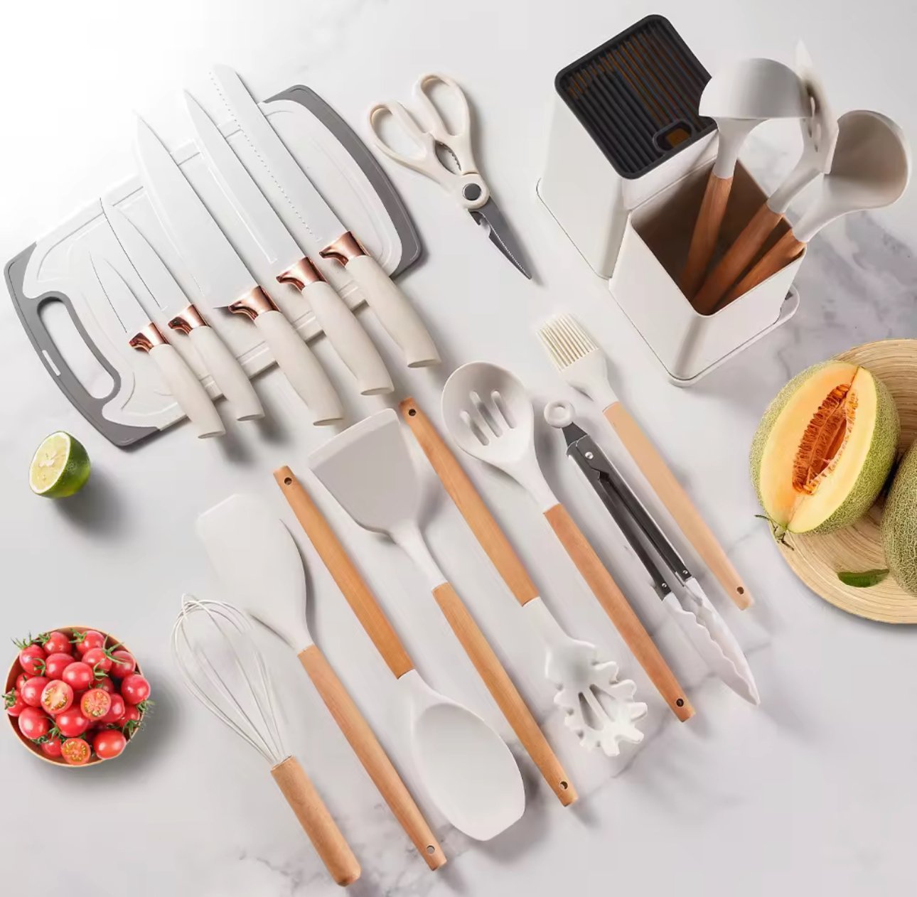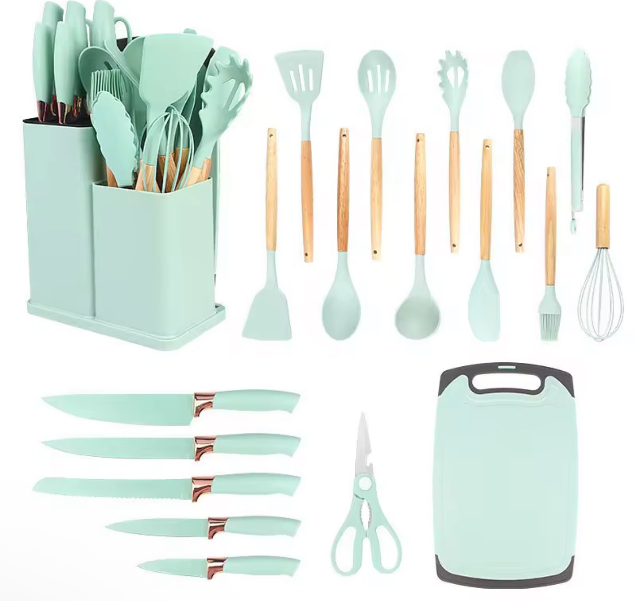 - Juego de 19 utensilios de cocina antiadherentes de silicona con mango de madera, espátula, batidores de huevos y accesorios de cocina resistentes al calor