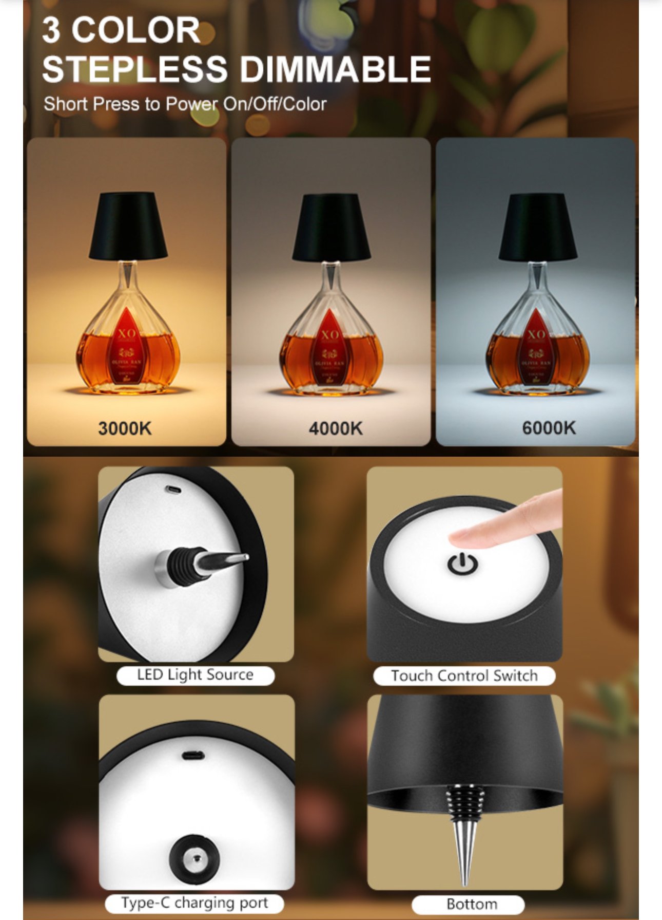 - LUZ DE BOTELLA INALÁMBRICA REGULABLE TÁCTIL: Esta luz inalámbrica está disponible en tres colores, lo que le permite crear el ambiente perfecto para cualquier ocasión.