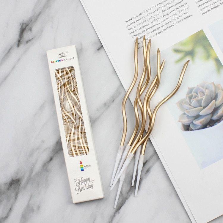 Velas de cumpleaños en hilo colorido, color dorado, velas retorcidas de oro y plata, velas curvas para pasteles de 6 und.